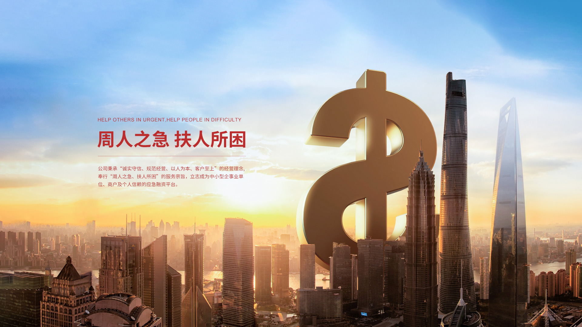 公司秉承“誠實守信、規范經營、以人為本、客戶至上”的經營理念,奉行“周人之急、扶人所困”的服務宗旨,立志成為中小型企事業單位、商戶及個人信賴的應急融資平臺。